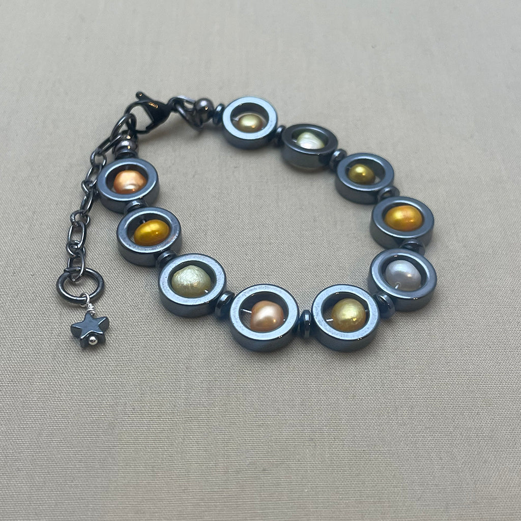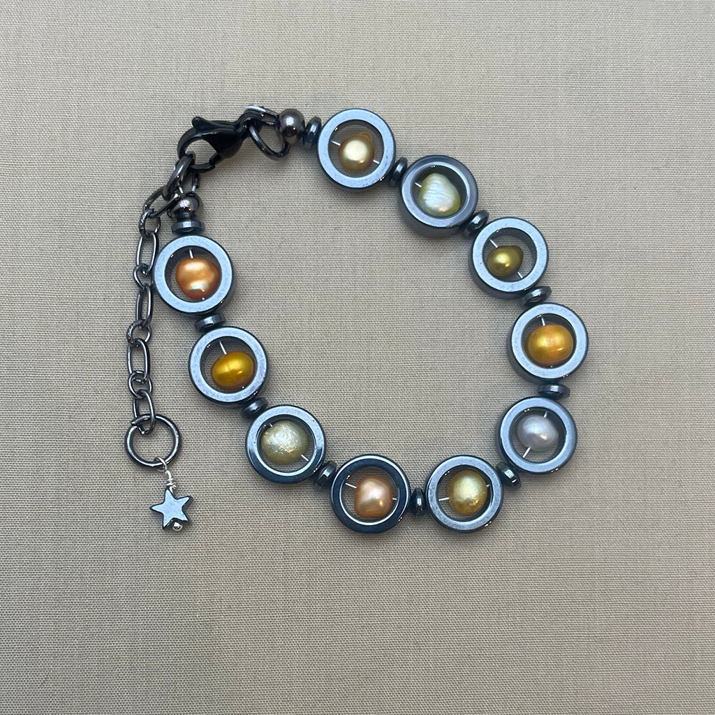 Ett elegant armband av hematitcirklar som omfattar sötvattenpärlor i olika gula nyanser. Mellan varje cirkel finns en mellanpärla, också av blodsten, som gör att armbandet formar sig fint runt handleden. Alla metalldelar är bly- och nickelfria.