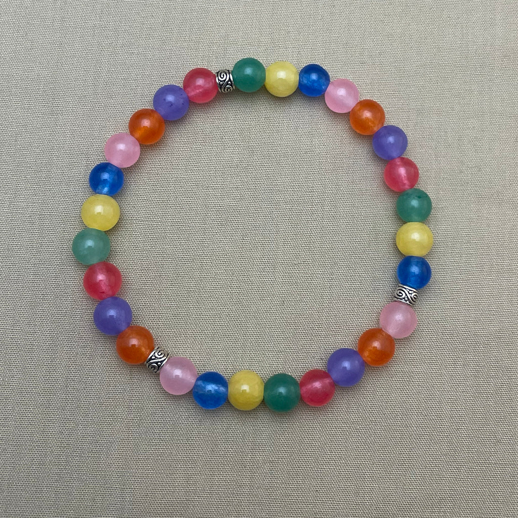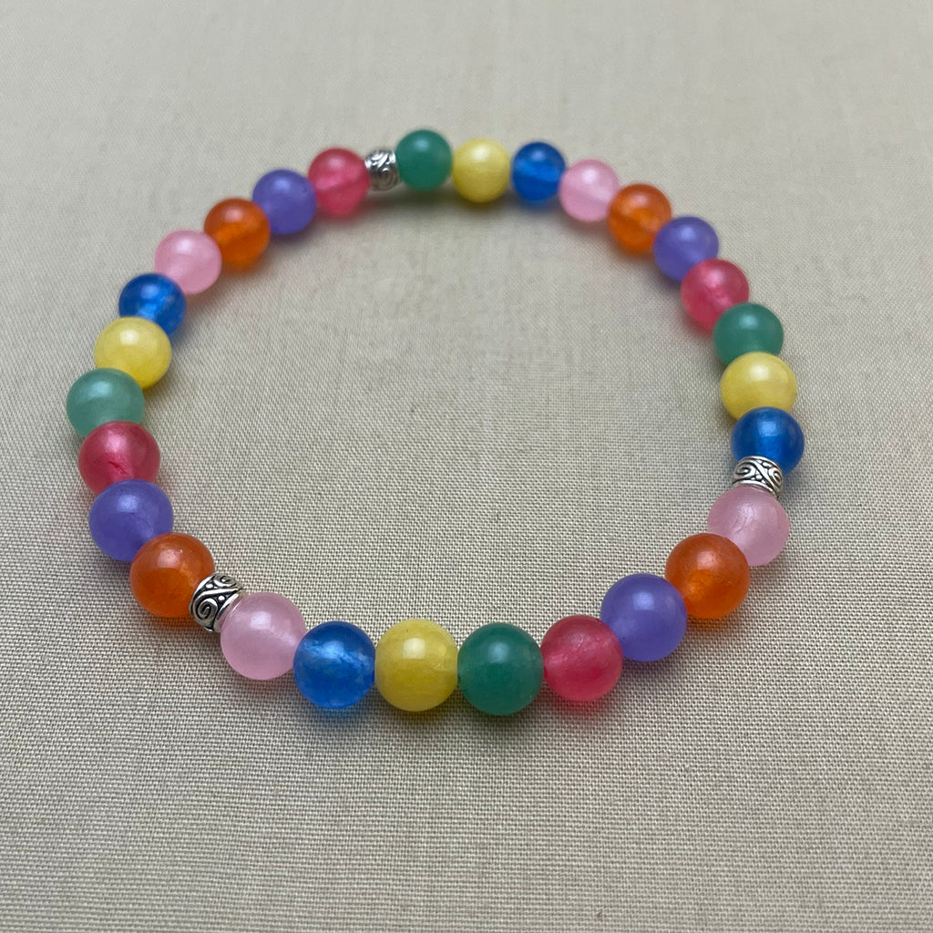 Ett vackert armband av halvädelstenar. Pärlorna, av gul, orange, grön, lila, blå och rosa jade, är trädda på elastisk tråd och anpassar sig efter handleden. Alla metalldelar är bly- och nickelfria.