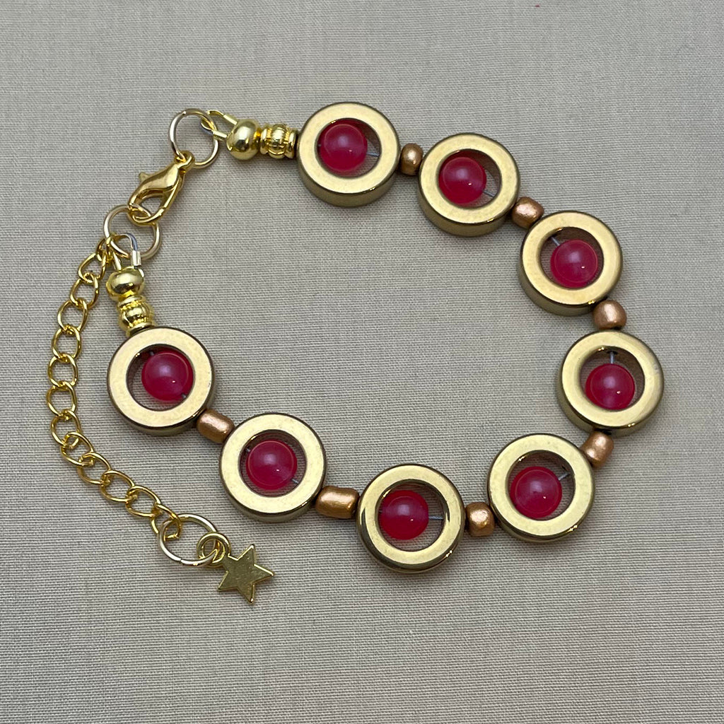 Ett elegant armband av elektropläterade hematitcirklar i guldkulör som omfattar halvädelstenar av rosa jade. Mellan varje cirkel finns en mellanpärla, av guldfärgad seedbead, som gör att armbandet formar sig fint runt handleden. Alla metalldelar är bly- och nickelfria.