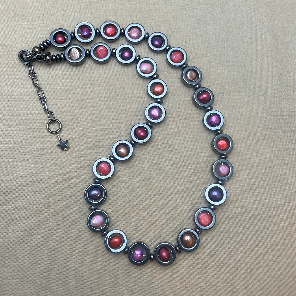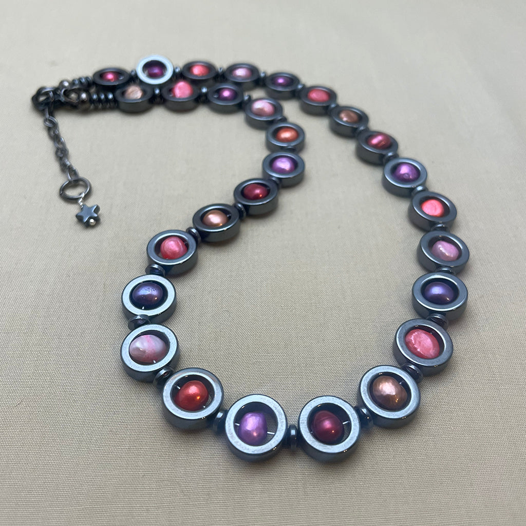 Ett elegant halsband av hematitcirklar som omfattar sötvattenpärlor i olika rosa nyanser. Mellan varje cirkel finns en mellanpärla, också av blodsten, som gör att halsbandet formar sig fint runt halsen. Alla metalldelar är bly- och nickelfria.