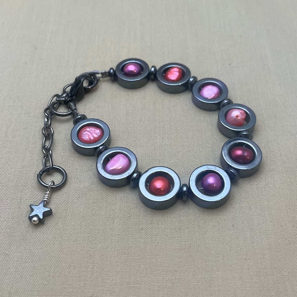 Antal pärlor: 9 st hematitcirklar med sötvattenpärla.