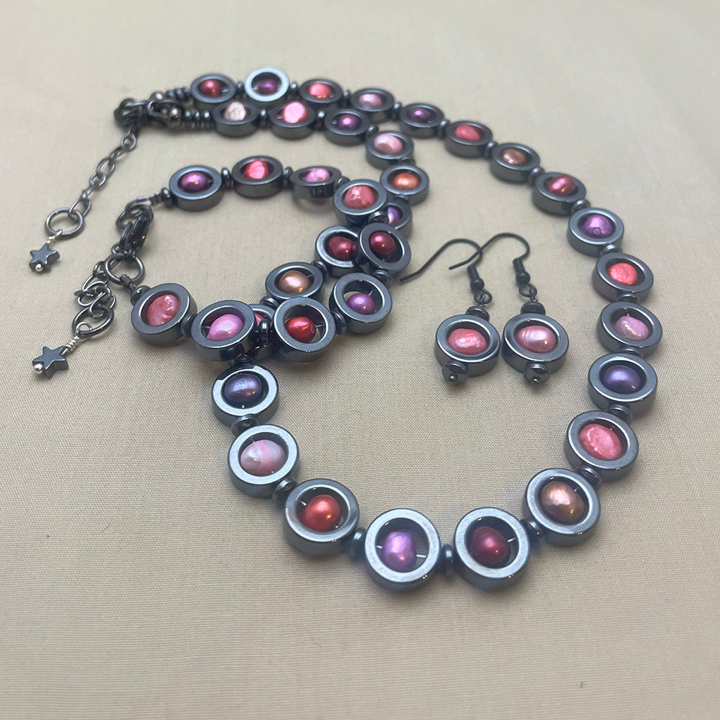 Ett elegant smyckeset med halsband, armband och örhängen av hematitcirklar som omfattar sötvattenpärlor i olika rosa nyanser. Mellan varje cirkel finns en mellanpärla, också av blodsten, som gör att smyckena formar sig fint. Alla metalldelar är bly- och nickelfria.